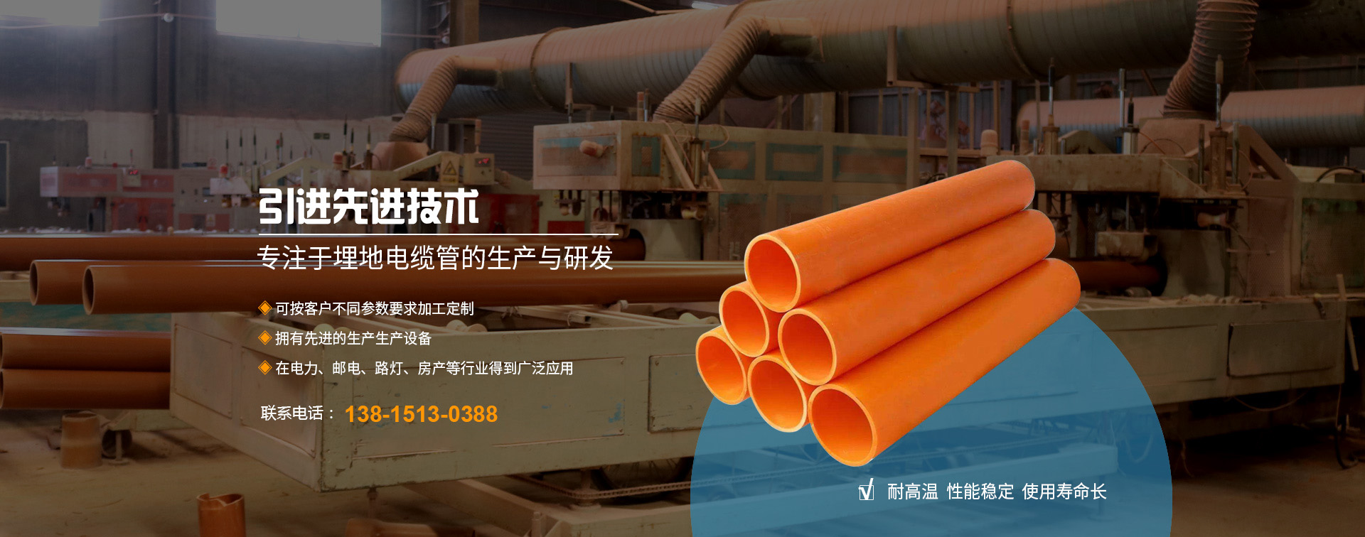無錫邁力塑業(yè)科技有限公司地處長江三角洲蘇錫常經(jīng)濟發(fā)達區(qū),坐落于江南名鎮(zhèn)--華士鎮(zhèn),緊鄰天下第一村“中國華西村”,緊靠沿江高速華西道口,距上海130公里、南京150公里,地理位置優(yōu)越,交通十分便捷。       本廠創(chuàng)辦于2010年,全廠職工總數(shù)為42名,工程師技術(shù)人員5名,擁有國內(nèi)先進的錐形雙螺桿、單螺桿擠出生產(chǎn)線9條,是專業(yè)生產(chǎn)PE頂管、PVC-U埋地式普通電力電纜管套、PVC-C高壓電纜套管、MPP電纜套管等管材、管件、BWFRP電纜管拉擠纏繞管。       本廠研制生產(chǎn)的埋地電力通訊電...